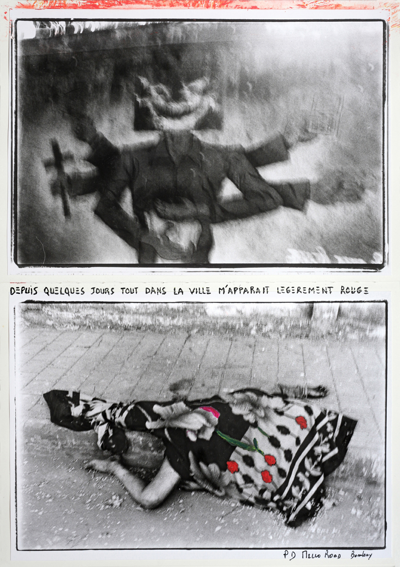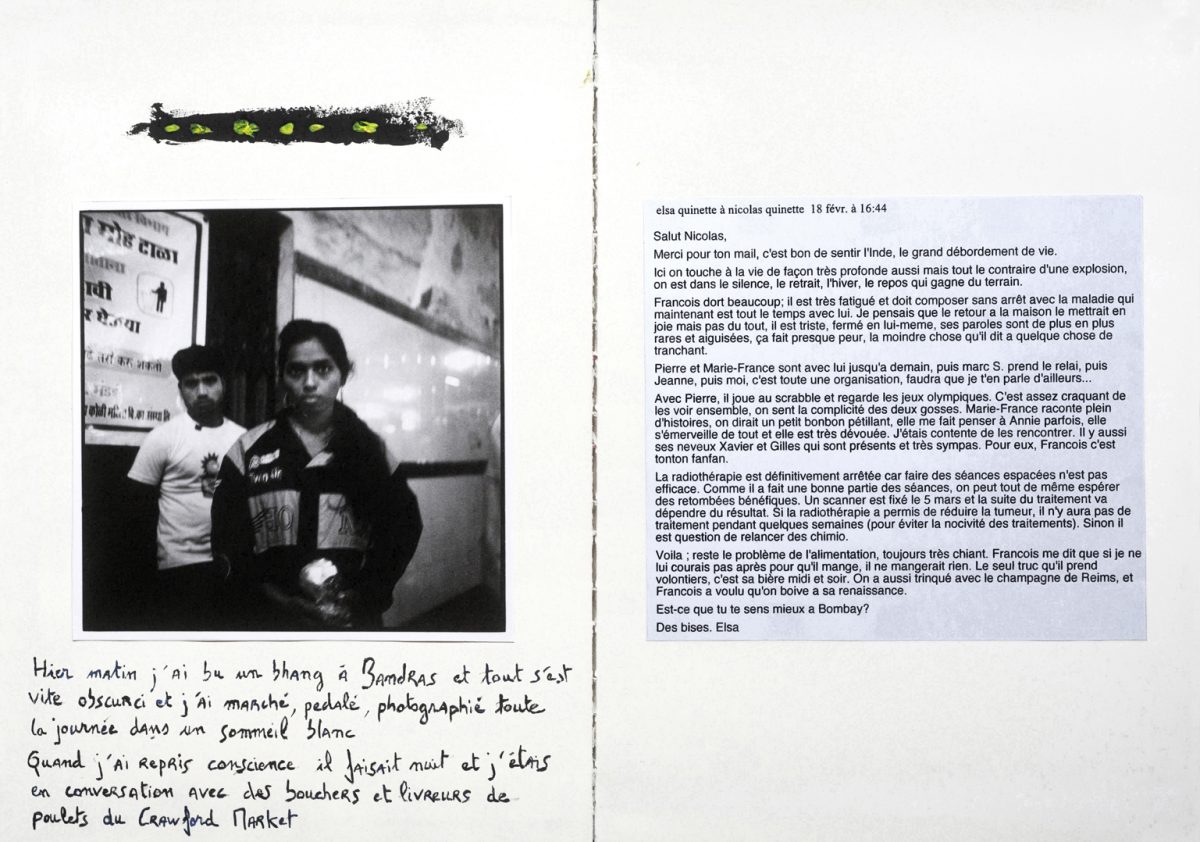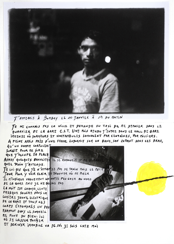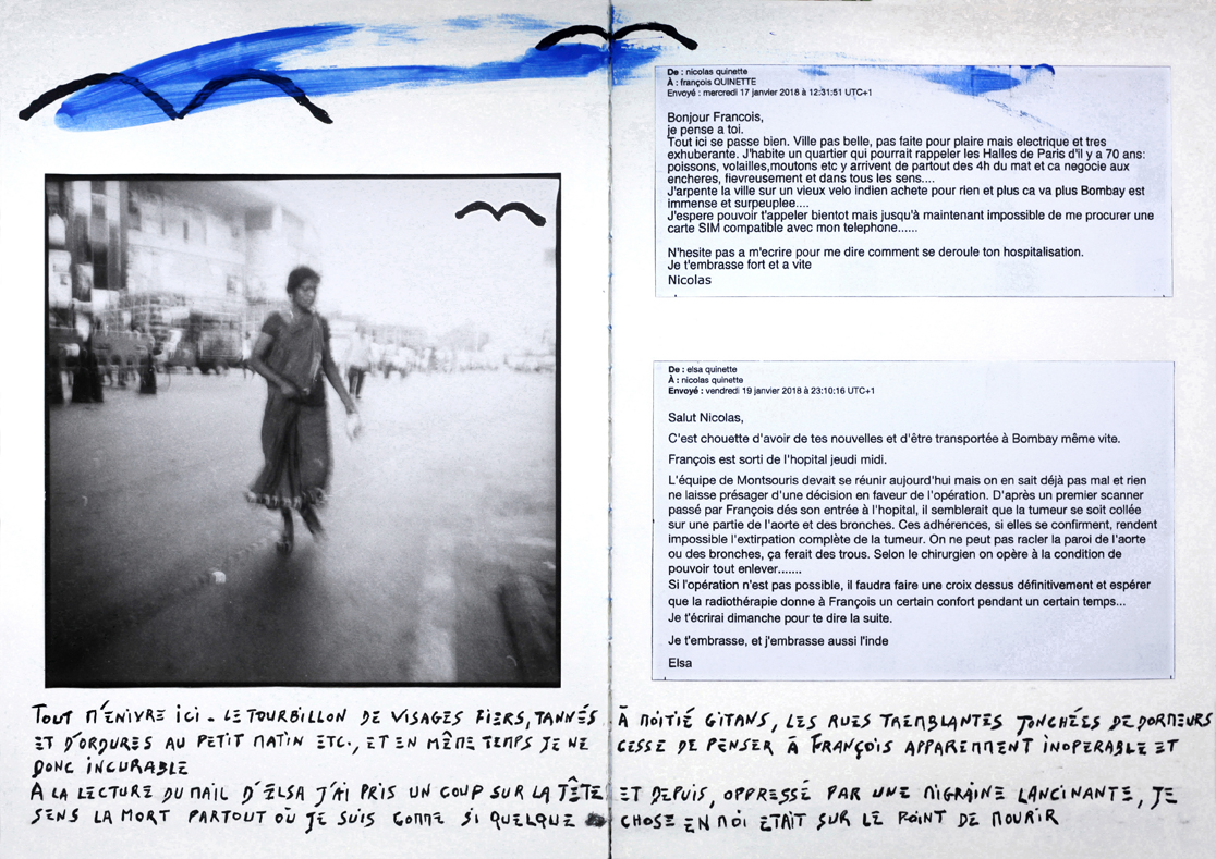 Hommes en errance dans la gare CST de Bombay/Inde la nuit. Portraits d'adolescents dans les rues de Bombay en janvier 2018 Femme dans rue de Bombay et textes évoquant la maladie de mon père, inopérable, en janvier 2018. Foule de visages dans une rue de Bombay en 2018 Glaneur et têtes de poisson dans les rues de Bombay en 2018 Sheila et Raju dans une rue de Bombay en 2018 Saltimbanque aux couteaux dans les yeux dans une rue de Bombay et textes évoquant Bombay et mon père malade en 2018. Mort et divinité sur un trottoir de Bombay en 2018 Jeune femme et bâtiment en détresse à Bombay en 2018 Monsieur Krishna forain sur une avenue de Bombay en 2018 Quatre filles et un homme au sol à Null Bazar/Bombay en 2018 Fille courant dans une rue d'Hyderabad/Inde, carte de Hyderabad, lettre à mon père. A Nampali/Hyderabad paysage urbain désolé et homme gisant tête dans le vide Groupe d'hommes assis près de le gare de Hyderabad en Inde Mosquée Ek Minar de Nampali, quartier de Hyderabad et plan de Nampali dessiné et peint Tête de femme dans Bombay, homme couché sur un trottoir de Bombay et peinture rouge 2 commerçants près du Crawford Market de Bombay et des infos sur mon père malade en 2018 Poissonniers sur Sassoon Dock en fin de nuit à Bombay et texte où je dis que je cherche des coquillages pour mes enfants.
